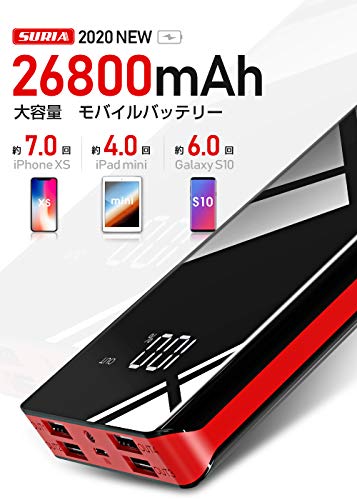 - 【26800mAhモバイルバッテリー】26800mAh超大容量を備え、スマホ、タブレットや、カメラ、ゲーム機にも充電できるモバイルバッテリーです。iphoneXSを約7回、Galaxy S10を約5回、iPad miniを約4回充電できます。旅行、出張など電源の取りにくい環境でバッテリー切れの心配がありません。(※ご注意:モバイルバッテリー本体は26800mAhの大容量なので、少々重量があります。予めご了承ください。)